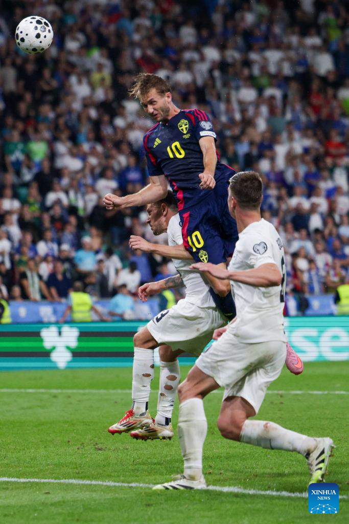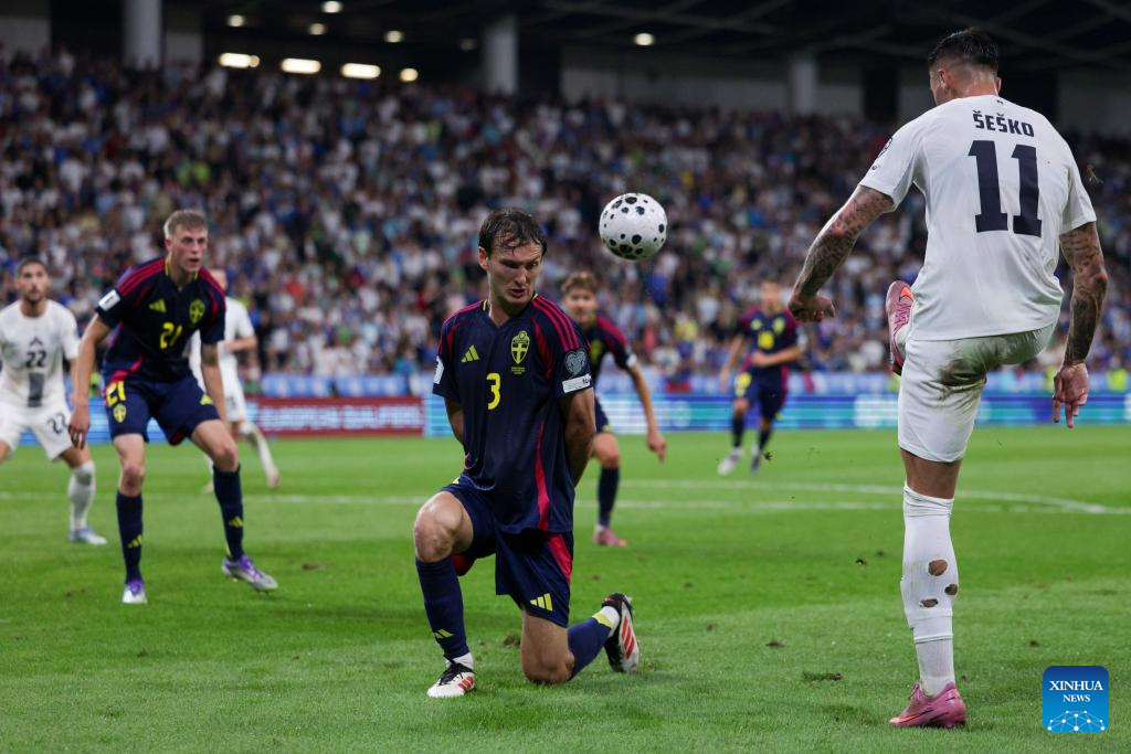 Benjamin Nygren (C) of Sweden competes for a header during the 2026 FIFA World Cup Qualifiers football match between Slovenia and Sweden in Ljubljana, Slovenia, Sept. 5, 2025. (Photo by Zeljko Stevanic/Xinhua)