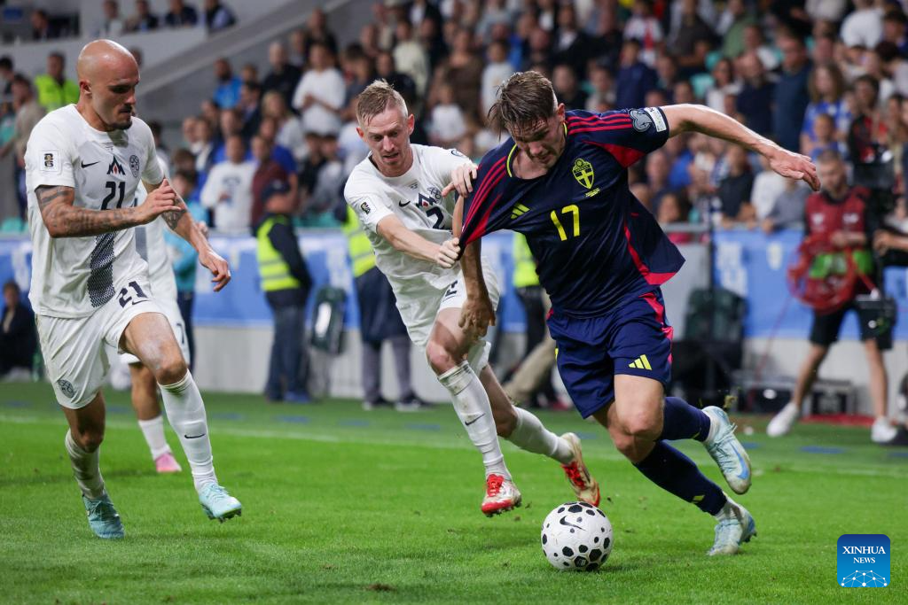 Viktor Gyokeres (2nd L) of Sweden competes during the 2026 FIFA World Cup Qualifiers football match between Slovenia and Sweden in Ljubljana, Slovenia, Sept. 5, 2025. (Photo by Zeljko Stevanic/Xinhua)