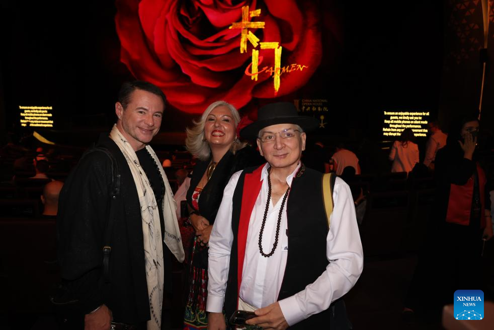 Spectators dressed in Spanish garment pose for a photo as they come to view the opera "Carmen" by China National Opera House in Riyadh, Saudi Arabia, Sept. 4, 2025. (Xinhua/Wang Haizhou)