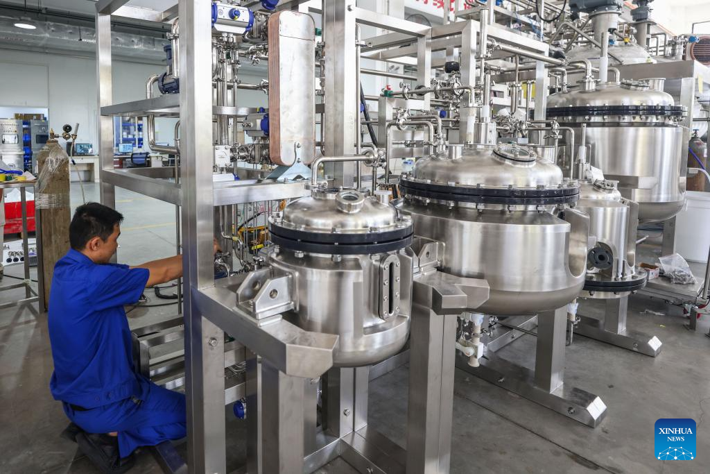 A worker assembles a medicine production equipment at a company in Ding'an Taling industrial park in Ding'an, south China's Hainan Province, Sept. 4, 2025. (Xinhua/Zhang Liyun)