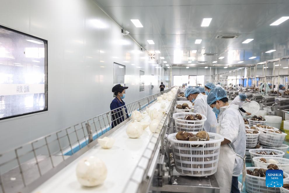 Workers process coconuts on a production line at a company in Ding'an Taling industrial park in Ding'an, south China's Hainan Province, Sept. 4, 2025. (Xinhua/Zhang Liyun)