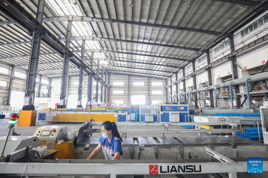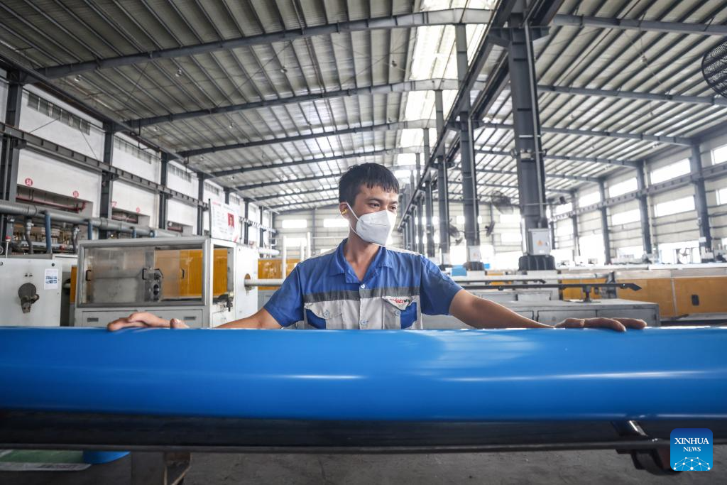 A worker checks the operation of a production line at a company in Ding'an Taling industrial park in Ding'an, south China's Hainan Province, Sept. 4, 2025. (Xinhua/Zhang Liyun)