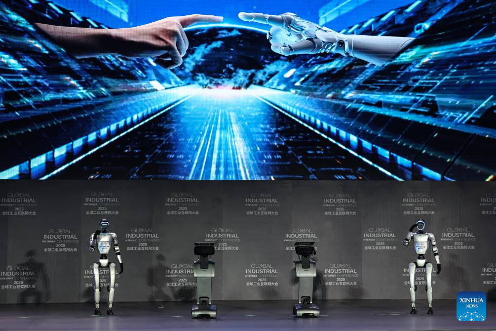 A humanoid robot of China Mobile is pictured at the exhibition area of the 2025 Global Industrial Internet Conference in Shenyang, northeast China's Liaoning Province, Sept. 7, 2025. Themed "Digital New Chapter, Intelligent New Quality," the 2025 Global Industrial Internet Conference kicked off here on Saturday and will last till Sept. 8. (Photo by Wang Yuyan/Xinhua)