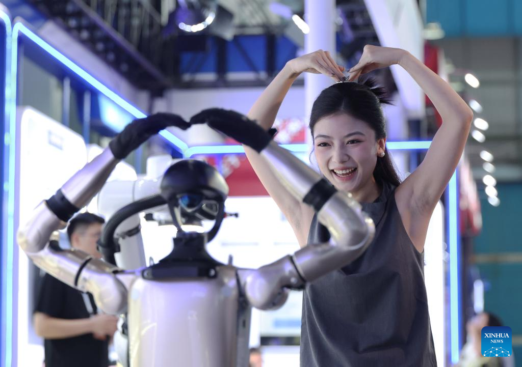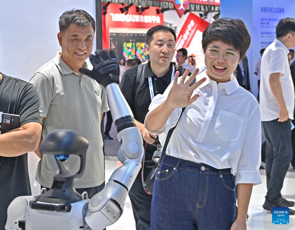 A visitor interacts with a robot at the exhibition area of the 2025 Global Industrial Internet Conference in Shenyang, northeast China's Liaoning Province, Sept. 6, 2025. Themed "Digital New Chapter, Intelligent New Quality," the 2025 Global Industrial Internet Conference kicked off here on Saturday and will last till Sept. 8. (Xinhua/Yang Qing)