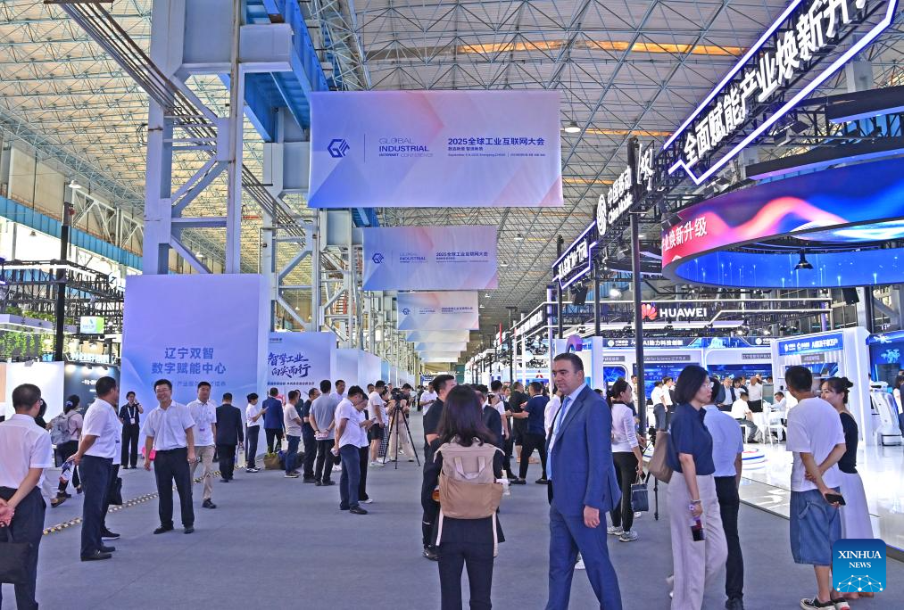People visit the exhibition area of the 2025 Global Industrial Internet Conference in Shenyang, northeast China's Liaoning Province, Sept. 6, 2025. Themed "Digital New Chapter, Intelligent New Quality," the 2025 Global Industrial Internet Conference kicked off here on Saturday and will last till Sept. 8. (Xinhua/Pan Yulong)