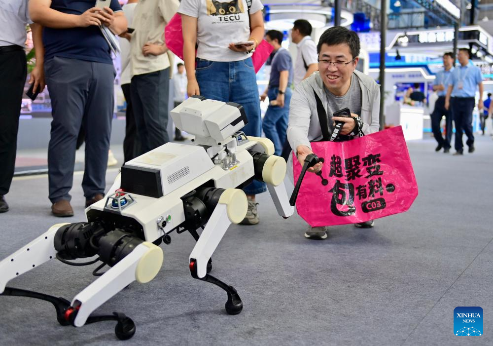 A visitor interacts with a robot dog of Lenovo at the exhibition area of the 2025 Global Industrial Internet Conference in Shenyang, northeast China's Liaoning Province, Sept. 6, 2025. Themed "Digital New Chapter, Intelligent New Quality," the 2025 Global Industrial Internet Conference kicked off here on Saturday and will last till Sept. 8. (Xinhua/Wu Qinghao)