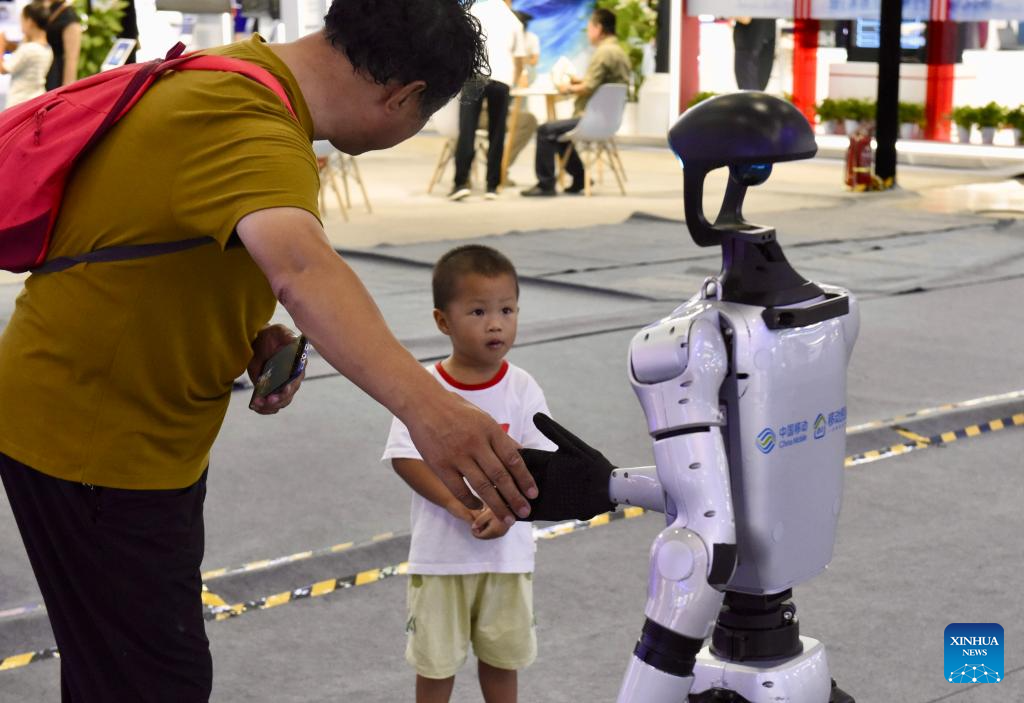 Visitors interact with a humanoid robot of China Mobile at the exhibition area of the 2025 Global Industrial Internet Conference in Shenyang, northeast China's Liaoning Province, Sept. 7, 2025. Themed "Digital New Chapter, Intelligent New Quality," the 2025 Global Industrial Internet Conference kicked off here on Saturday and will last till Sept. 8. (Photo by Wang Yuyan/Xinhua)