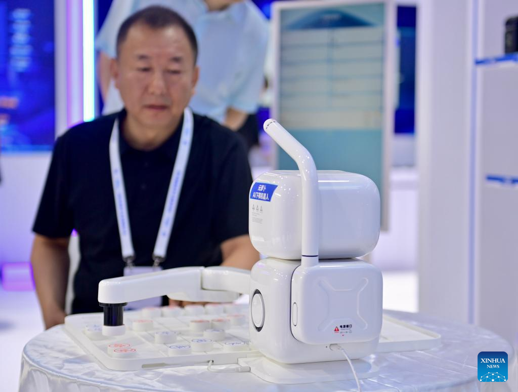 A visitor plays Chinese chess with a robot at the exhibition area of the 2025 Global Industrial Internet Conference in Shenyang, northeast China's Liaoning Province, Sept. 6, 2025. Themed "Digital New Chapter, Intelligent New Quality," the 2025 Global Industrial Internet Conference kicked off here on Saturday and will last till Sept. 8. (Xinhua/Wu Qinghao)