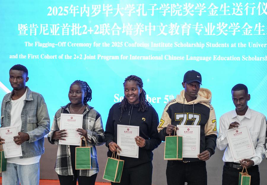NAIROBI, Sept. 6 (Xinhua) -- A flag-off ceremony was held on Friday for scholarship students from the Confucius Institute at the University of Nairobi in Kenya, who are heading to Tianjin Normal University in China for advanced Mandarin (standard Chinese language) studies. Among them, 20 students will embark on a two-year study program in China.