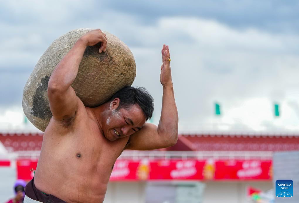 A contestant competes in a stone-carrying competition during the 2025 edition of a traditional horse racing festival in Nagqu, southwest China's Xizang Autonomous Region, Sept. 5, 2025. The three-day festival, a traditional event on the northern Tibetan Plateau, kicked off in Nagqu on Friday. In addition to traditional horse racing, the festival also features a variety of ethnic sports competitions, art performances, and cultural tourism activities, drawing large crowds of locals and visitors. (Xinhua/Tenzin Nyida)