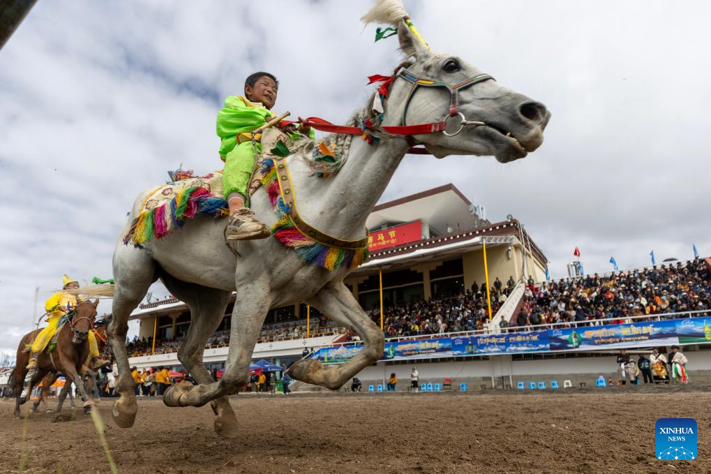 Young riders compete in a horse race during the 2025 edition of a traditional horse racing festival in Nagqu, southwest China's Xizang Autonomous Region, Sept. 6, 2025. The three-day festival, a traditional event on the northern Tibetan Plateau, kicked off in Nagqu on Friday. In addition to traditional horse racing, the festival also features a variety of ethnic sports competitions, art performances, and cultural tourism activities, drawing large crowds of locals and visitors. (Xinhua/Jiang Fan)