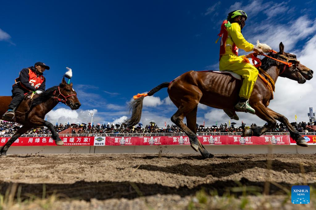 Contestants compete in the 2025 edition of a traditional horse racing festival in Nagqu, southwest China's Xizang Autonomous Region, Sept. 7, 2025. The three-day festival, a traditional event on the northern Tibetan Plateau, kicked off in Nagqu on Friday. In addition to traditional horse racing, the festival also features a variety of ethnic sports competitions, art performances, and cultural tourism activities, drawing large crowds of locals and visitors. (Xinhua/Tenzin Nyida)