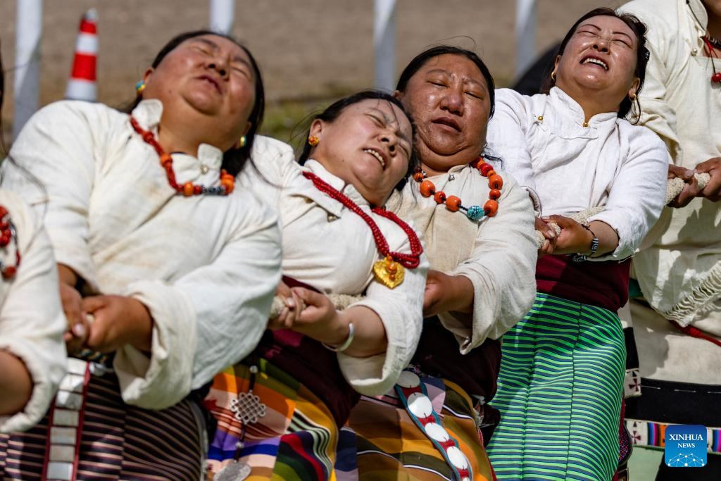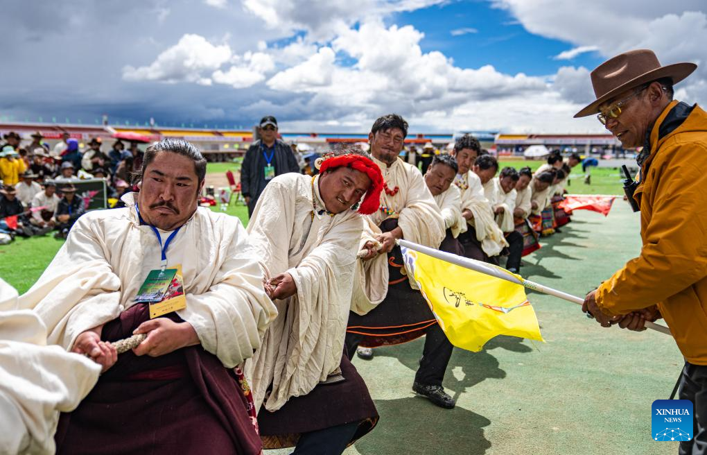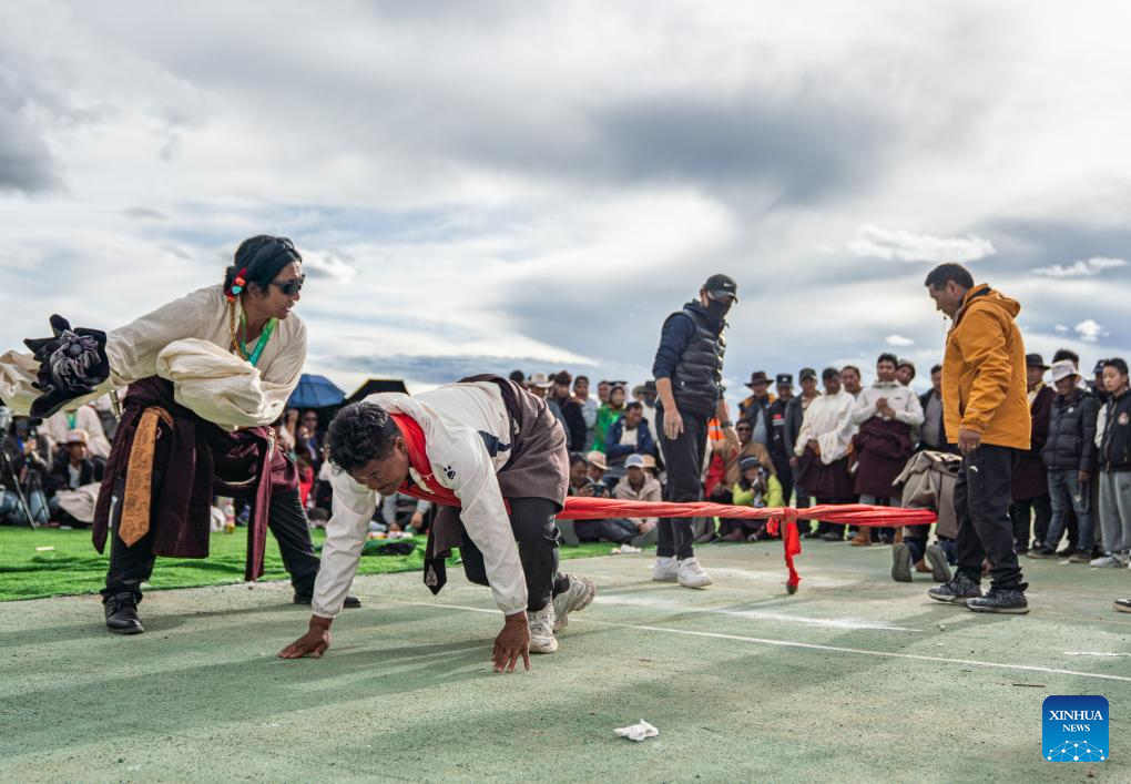 Contestants compete in Yaja competition, a traditional Tibetan sport similar to a one-on-one tug-of-war, during the 2025 edition of a traditional horse racing festival in Nagqu, southwest China's Xizang Autonomous Region, Sept. 6, 2025. The three-day festival, a traditional event on the northern Tibetan Plateau, kicked off in Nagqu on Friday. In addition to traditional horse racing, the festival also features a variety of ethnic sports competitions, art performances, and cultural tourism activities, drawing large crowds of locals and visitors. (Xinhua/Tenzin Nyida)
