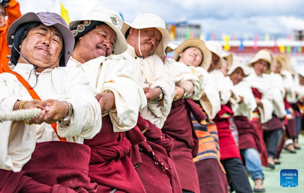 Contestants compete in tug-of-war during the 2025 edition of a traditional horse racing festival in Nagqu, southwest China's Xizang Autonomous Region, Sept. 6, 2025. The three-day festival, a traditional event on the northern Tibetan Plateau, kicked off in Nagqu on Friday. In addition to traditional horse racing, the festival also features a variety of ethnic sports competitions, art performances, and cultural tourism activities, drawing large crowds of locals and visitors. (Xinhua/Tenzin Nyida)