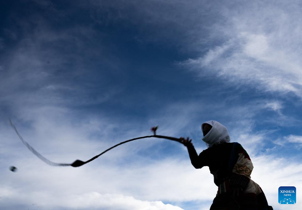 A contestant competes in Tibetan Sling competition, a traditional Tibetan competition that tests accuracy in stone throwing, during the 2025 edition of a traditional horse racing festival in Nagqu, southwest China's Xizang Autonomous Region, Sept. 6, 2025. The three-day festival, a traditional event on the northern Tibetan Plateau, kicked off in Nagqu on Friday. In addition to traditional horse racing, the festival also features a variety of ethnic sports competitions, art performances, and cultural tourism activities, drawing large crowds of locals and visitors. (Xinhua/Tenzin Nyida)