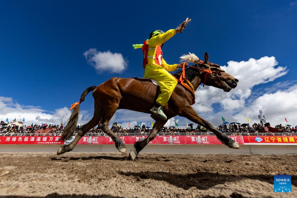 Contestants compete in the 2025 edition of a traditional horse racing festival in Nagqu, southwest China's Xizang Autonomous Region, Sept. 6, 2025. The three-day festival, a traditional event on the northern Tibetan Plateau, kicked off in Nagqu on Friday. In addition to traditional horse racing, the festival also features a variety of ethnic sports competitions, art performances, and cultural tourism activities, drawing large crowds of locals and visitors. (Xinhua/Jiang Fan)