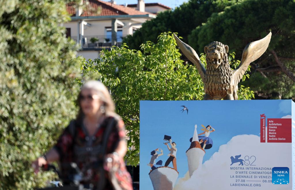 People walk past a poster during the 82nd Venice Film Festival in Venice, Italy, Aug. 30, 2025. (Xinhua/Li Jing)