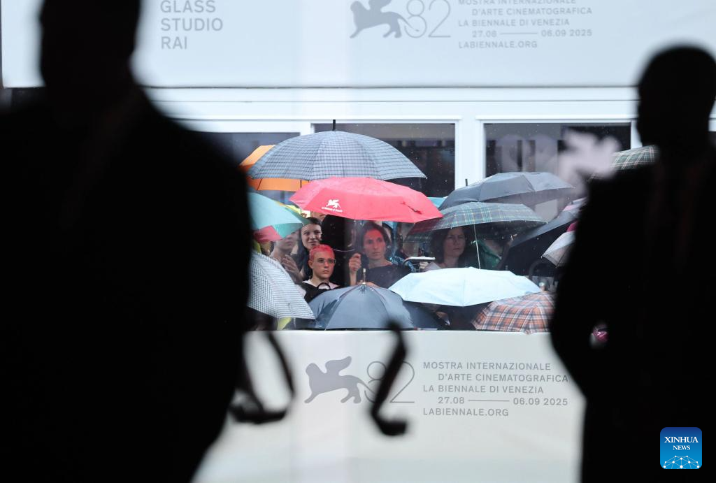 Film fans wait in front of the Palazzo del Cinema amid the rain during the 82nd Venice Film Festival in Venice, Italy, Aug. 29, 2025. (Xinhua/Li Jing)