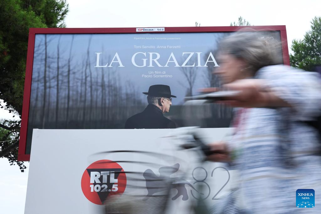 A woman passes the poster of the film "La Grazia" during the 82nd Venice Film Festival in Venice, Italy, Aug. 28, 2025. (Xinhua/Li Jing)