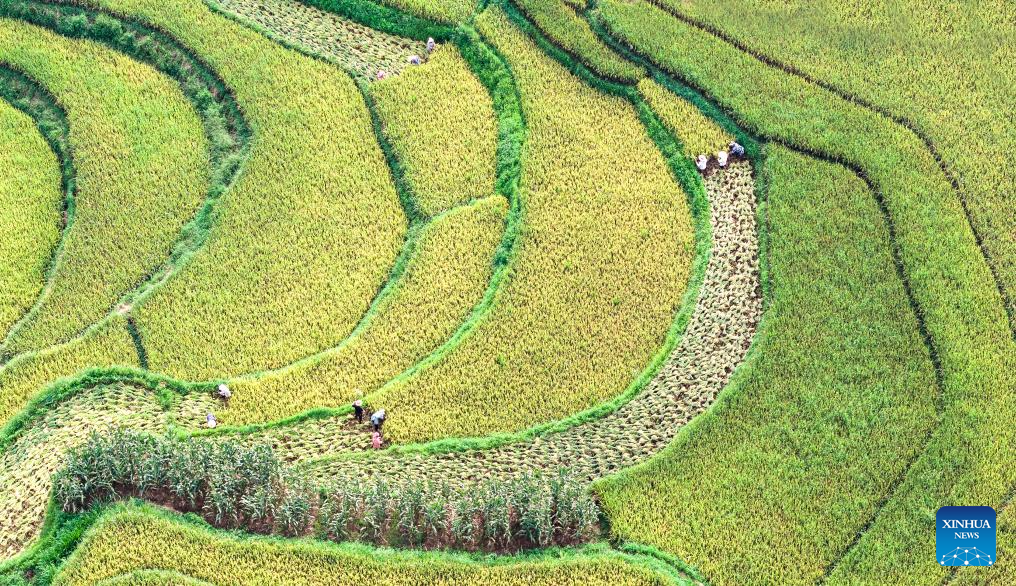 An aerial drone photo taken on Sept. 6, 2025 shows farmers harvesting rice in the paddy field in Wenshan Zhuang and Miao Autonomous Prefecture, southwest China's Yunnan Province. White Dew, a solar term meaning dew curdles and it starts to get cold, falls on Sept. 7 this year. (Photo by Xiong Pingxiang/Xinhua)