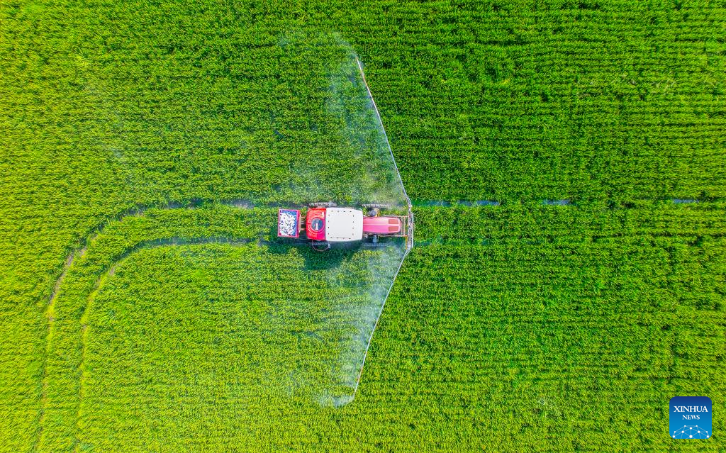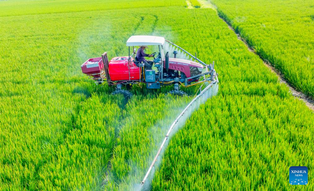 An aerial drone photo taken on Sept. 6, 2025 shows a farmer operating a vehicle to spray pesticides in a rice field in Hai'an City, east China's Jiangsu Province. White Dew, a solar term meaning dew curdles and it starts to get cold, falls on Sept. 7 this year. (Photo by Zhai Huiyong/Xinhua)