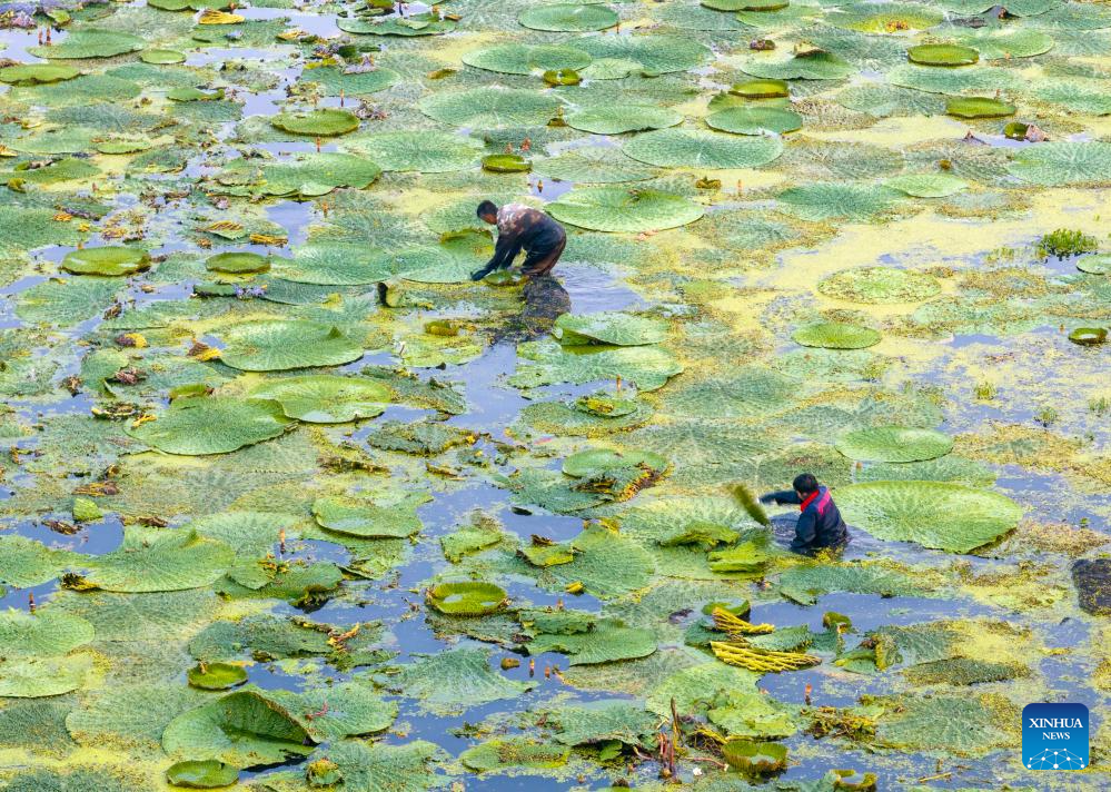 An aerial drone photo taken on Sept. 6, 2025 shows farmers harvesting gorgon fruit in Taizhou City, east China's Jiangsu Province. White Dew, a solar term meaning dew curdles and it starts to get cold, falls on Sept. 7 this year. (Photo by Tang Dehong/Xinhua)