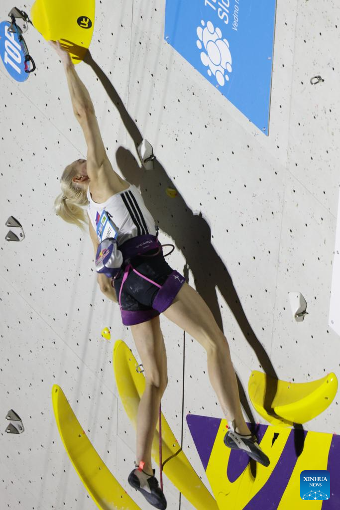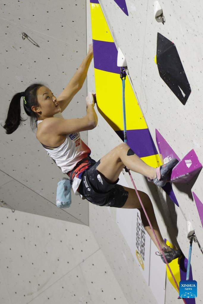 Seo Chaehyun of South Korea competes during the women's lead final of sport climbing at the IFSC Climbing World Cup Koper 2025 in Koper, Slovenia, Sept. 6, 2025. (Photo by Zeljko Stevanic/Xinhua)