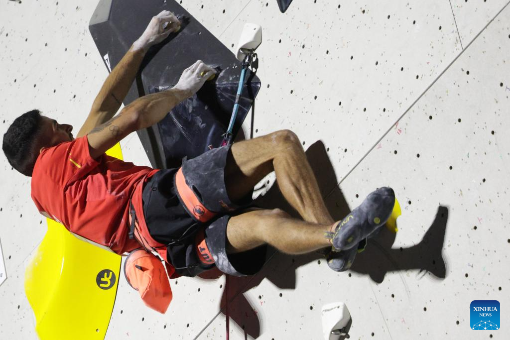 Alberto Gines Lopez of Spain competes during the men's lead final of sport climbing at the IFSC Climbing World Cup Koper 2025 in Koper, Slovenia, Sept. 6, 2025. (Photo by Zeljko Stevanic/Xinhua)