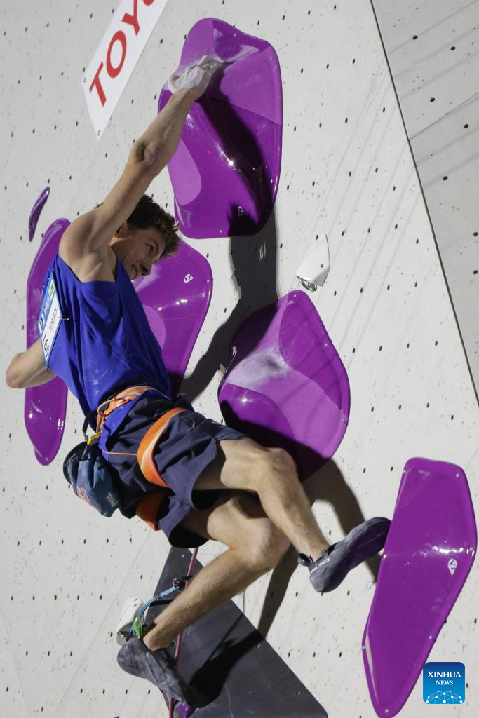 Anraku Sorato of Japan competes during the men's lead final of sport climbing at the IFSC Climbing World Cup Koper 2025 in Koper, Slovenia, Sept. 6, 2025. (Photo by Zeljko Stevanic/Xinhua)
