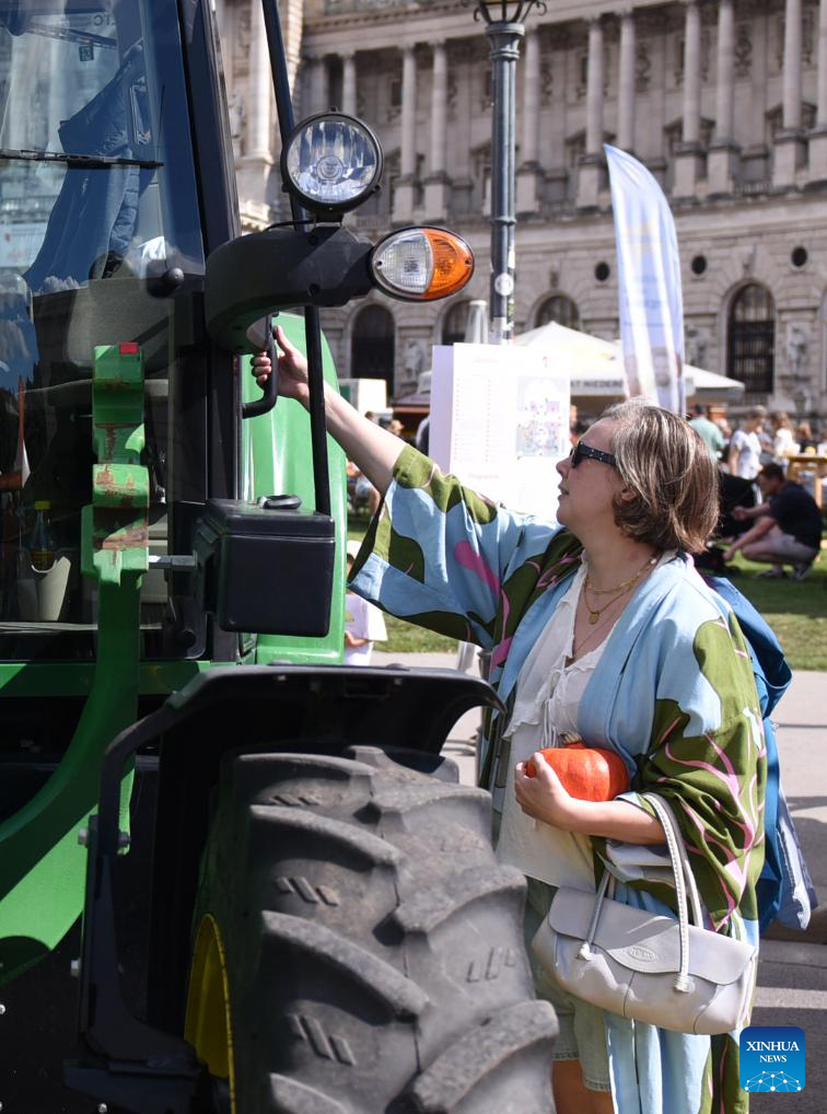 A visitor watches agricultural machinery during a harvest festival (the Erntedankfest) in Vienna, Austria, Sept. 6, 2025. The festival was held in Vienna on Sept. 6 to 7. (Xinhua/He Canling)