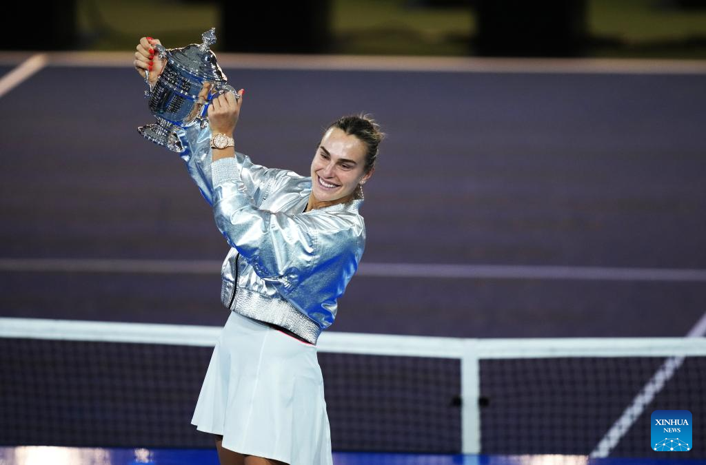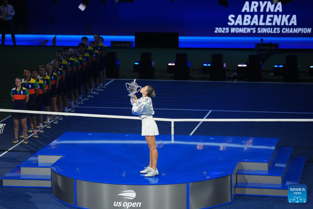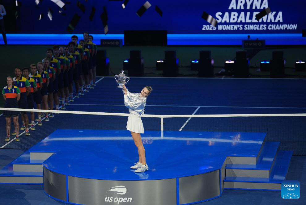 Aryna Sabalenka of Belarus poses with the trophy during the awarding ceremony for the women's singles event of the 2025 US Open tennis championships in New York, the United States, Sept. 6, 2025. (Xinhua/Wu Xiaoling)