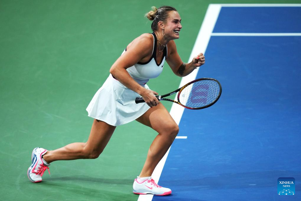 Aryna Sabalenka of Belarus celebrates after winning the women's singles final match against Amanda Anisimova of the United States at the 2025 US Open tennis championships in New York, the United States, Sept. 6, 2025. (Xinhua/Wu Xiaoling)
