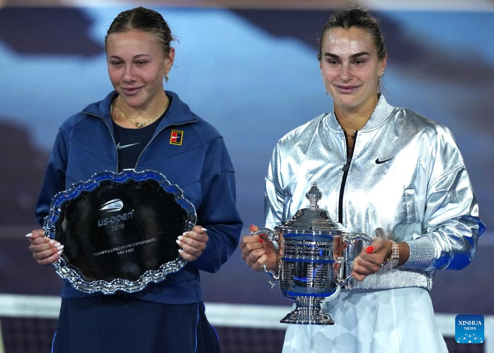 Aryna Sabalenka of Belarus (R) and Amanda Anisimova of the United States pose for photos during the awarding ceremony for the women's singles event of the 2025 US Open tennis championships in New York, the United States, Sept. 6, 2025. (Xinhua/Wu Xiaoling)