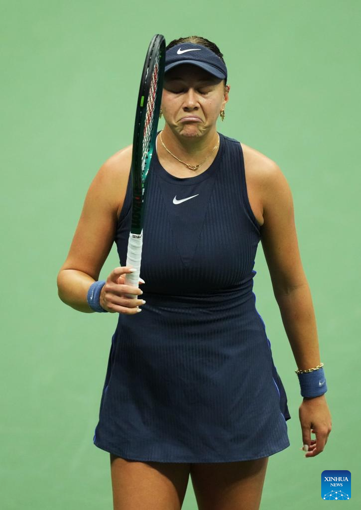 Amanda Anisimova of the United States reacts during the women's singles final match against Aryna Sabalenka of Belarus at the 2025 US Open tennis championships in New York, the United States, Sept. 6, 2025. (Xinhua/Wu Xiaoling)
