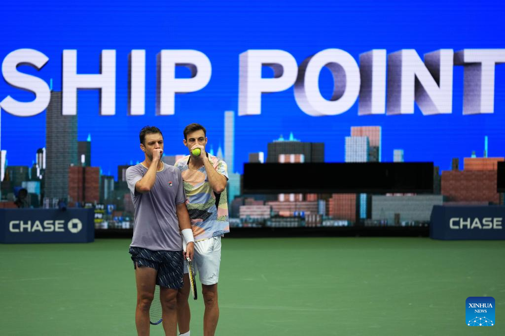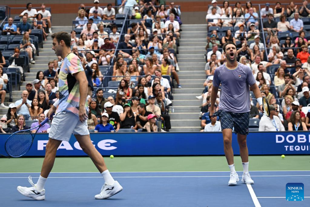 Marcel Granollers (R)/Horacio Zeballos communicate during the men's doubles final match between Marcel Granollers of Spain/Horacio Zeballos of Argentina and Joe Salisbury/Neal Skupski of Britain at the 2025 US Open tennis championships in New York, the United States, Sept. 6, 2025. (Xinhua/Wu Xiaoling)