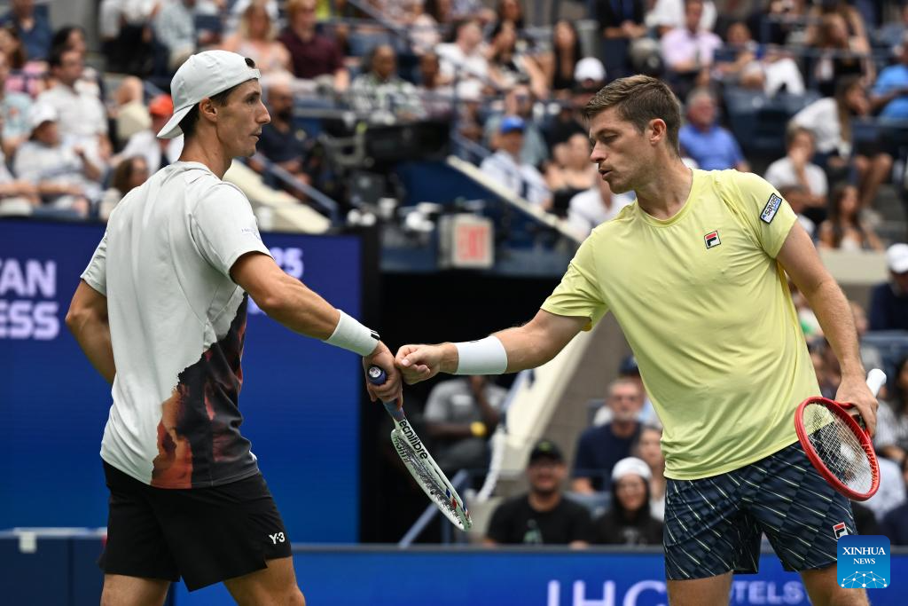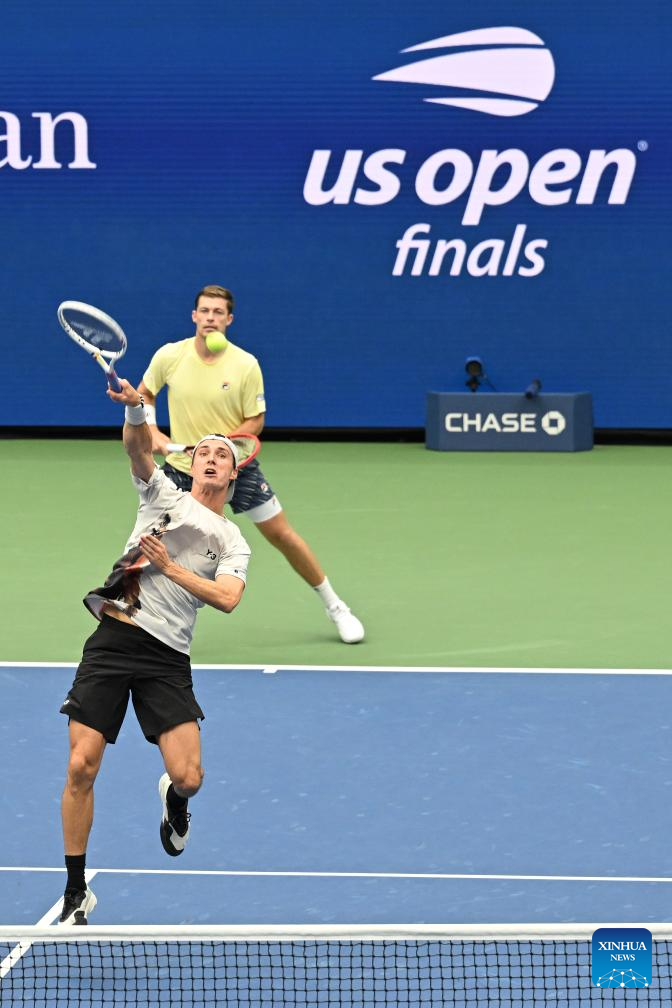 Joe Salisbury (front)/Neal Skupski return a hit during the men's doubles final match between Marcel Granollers of Spain/Horacio Zeballos of Argentina and Joe Salisbury/Neal Skupski of Britain at the 2025 US Open tennis championships in New York, the United States, Sept. 6, 2025. (Xinhua/Li Rui)