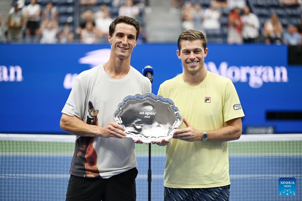 Joe Salisbury (L)/Neal Skupski pose for photos during the awarding ceremony for the men's doubles final match between Marcel Granollers of Spain/Horacio Zeballos of Argentina and Joe Salisbury/Neal Skupski of Britain at the 2025 US Open tennis championships in New York, the United States, Sept. 6, 2025. (Xinhua/Li Rui)