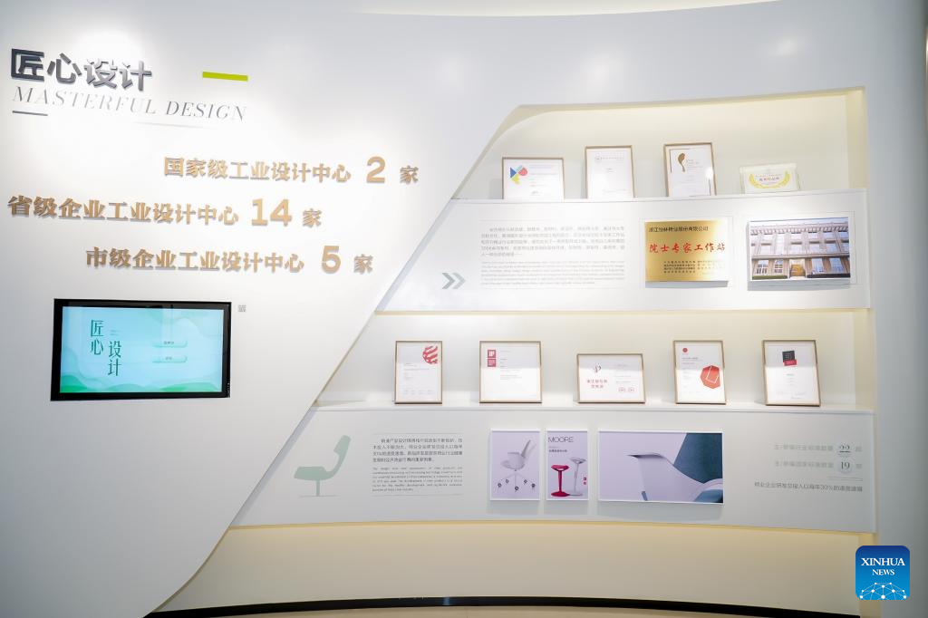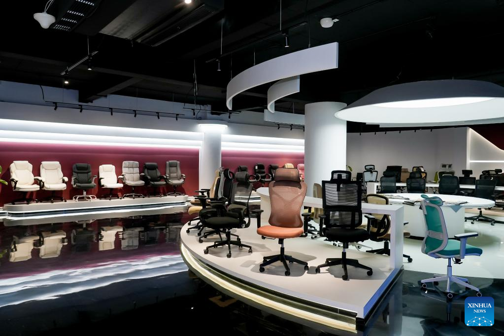 Chairs are displayed at the exhibition hall of Anji Wanbao Intelligent Home Technology Co., Ltd. in Anji County, east China's Zhejiang Province, Aug. 29, 2025. (Xinhua)