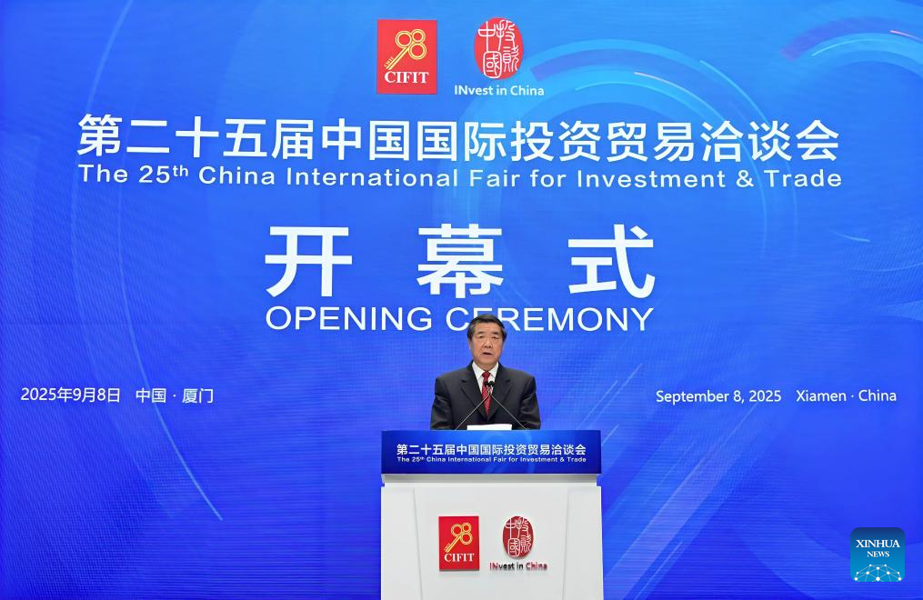 Chinese Vice Premier He Lifeng, also a member of the Political Bureau of the Communist Party of China Central Committee, reads out a congratulatory letter from Chinese President Xi Jinping and delivers an address at the opening ceremony of the 25th China International Fair for Investment and Trade (CIFIT) in Xiamen, southeast China's Fujian Province, Sept. 8, 2025. The 25th CIFIT opened here on Monday. (Xinhua/Wei Peiquan)