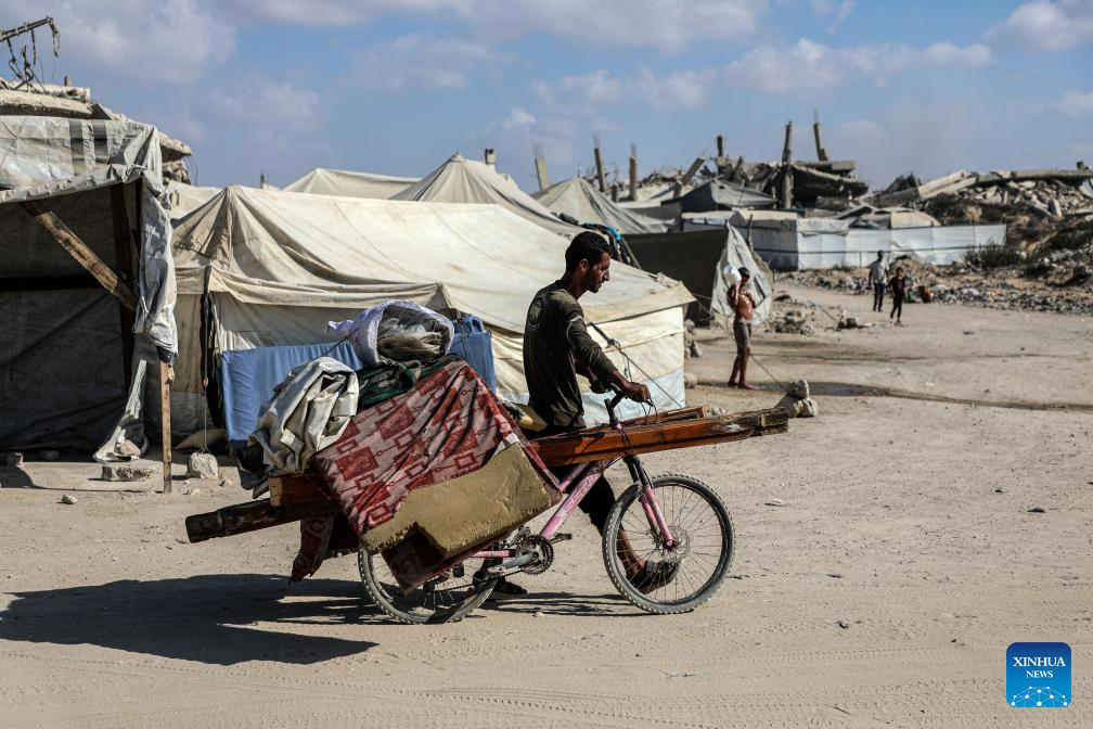 A Palestinian with his belongings flees from northern Gaza Strip toward south, on Sept. 9, 2025. The Israeli military on Tuesday ordered all residents of Gaza City to evacuate ahead of an expanded assault, warning that those who remain face grave danger. (Photo by Rizek Abdeljawad/Xinhua)