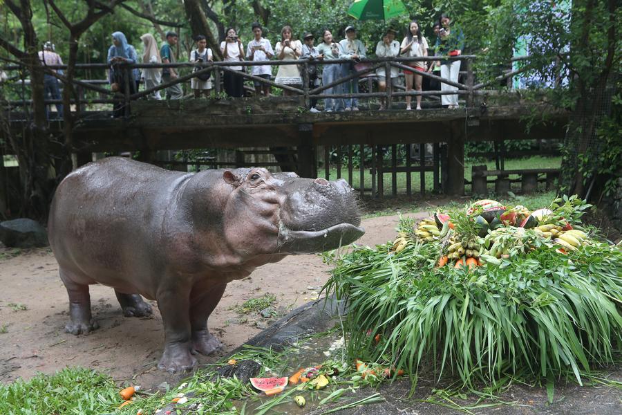 Mae Mali, a female hippopotamus, celebrates her 60th birthday at Khao Kheow Open Zoo in Chonburi province, Thailand on Sept. 8, 2025. (Photo by Rachen Sageamsak/Xinhua)