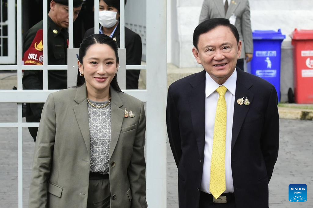 Former Thai Prime Minister Thaksin Shinawatra (R) and his daughter Paetongtarn Shinawatra arrive at the Supreme Court in Bangkok, Thailand, Sept. 9, 2025. Thailand's Supreme Court ruled on Tuesday that former Prime Minister Thaksin Shinawatra was unlawfully allowed to stay in hospital detention and should return to prison to complete his sentence. (Xinhua)