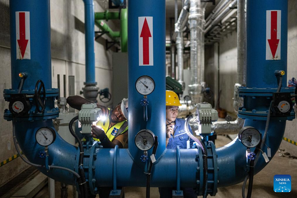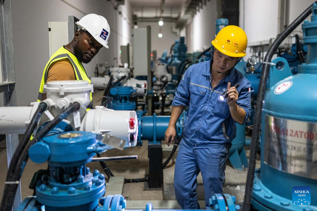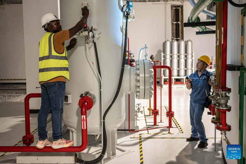 Local engineer Ntam Emmanuel Tooh (L) and a Chinese colleague work during an inspection at the Memve'ele Hydroelectric Power Station in the South Region of Cameroon, on June 30, 2025. Constructed by Sinohydro, Memve'ele Hydroelectric Power Station, a 211-megawatt hydroelectric power station in the Ntem Valley locality in Cameroon's South Region was officially handed over to Cameroonian authorities for operation in October 2024.(Xinhua/Wang Guansen)