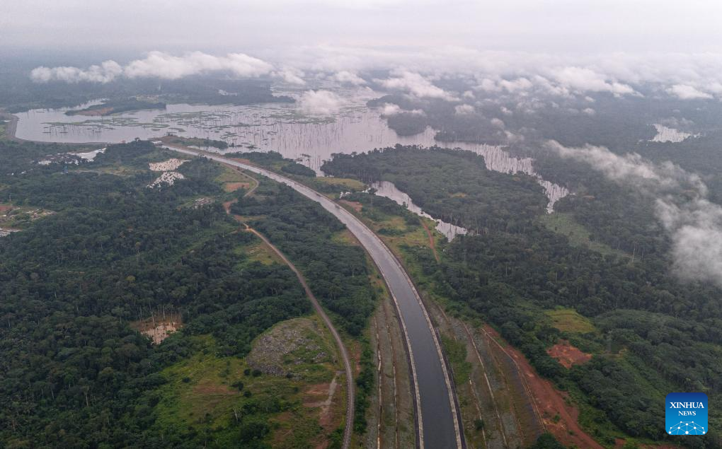 An aerial drone photo taken on June 30, 2025 shows the water canal of the Memve'ele Hydroelectric Power Station in the South Region of Cameroon. Constructed by Sinohydro, Memve'ele Hydroelectric Power Station, a 211-megawatt hydroelectric power station in the Ntem Valley locality in Cameroon's South Region was officially handed over to Cameroonian authorities for operation in October 2024.(Xinhua/Wang Guansen)