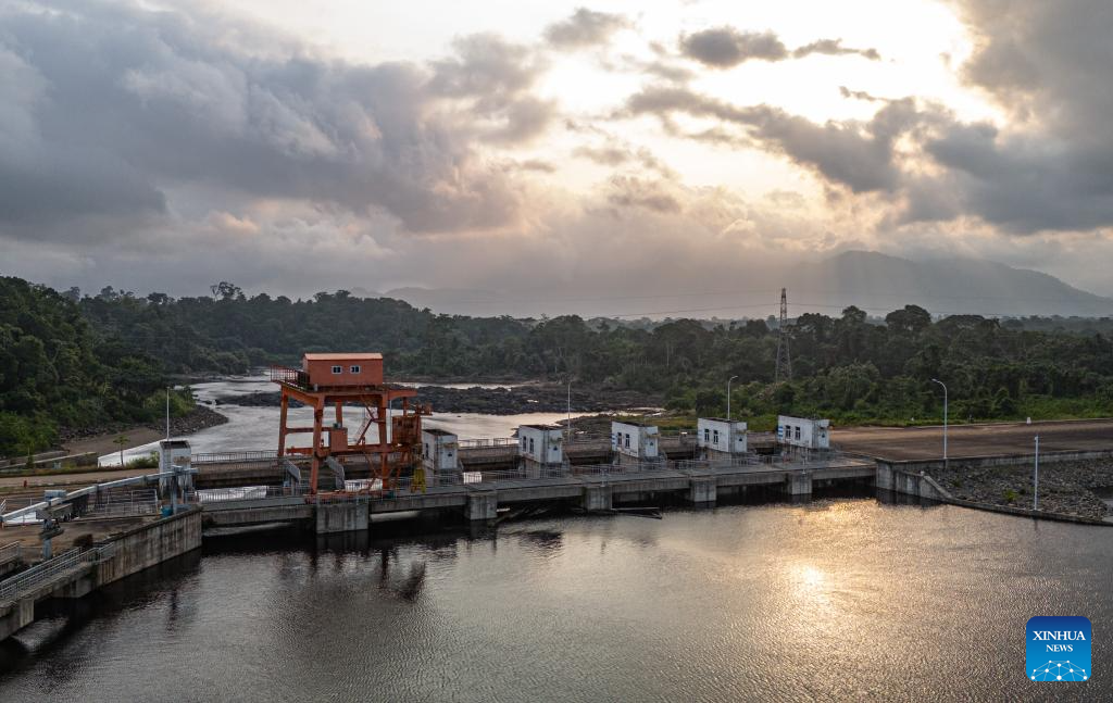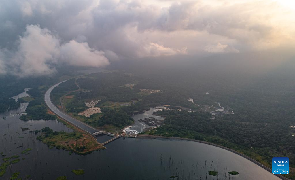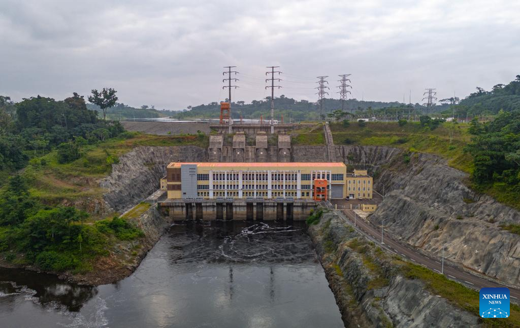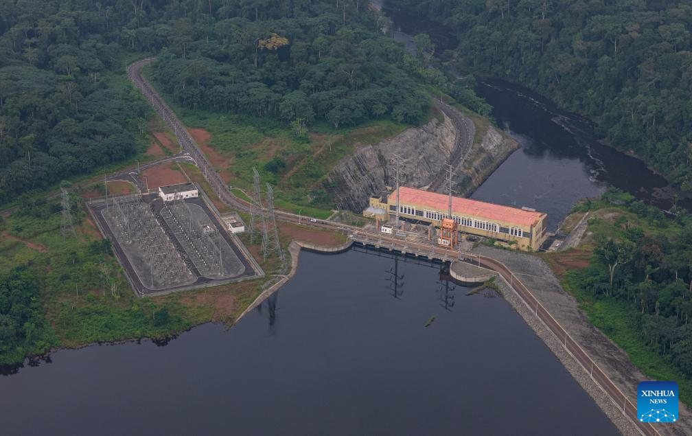 An aerial drone photo taken on June 30, 2025 shows a view of the Memve'ele Hydroelectric Power Station in the South Region of Cameroon. Constructed by Sinohydro, Memve'ele Hydroelectric Power Station, a 211-megawatt hydroelectric power station in the Ntem Valley locality in Cameroon's South Region was officially handed over to Cameroonian authorities for operation in October 2024.(Xinhua/Wang Guansen)