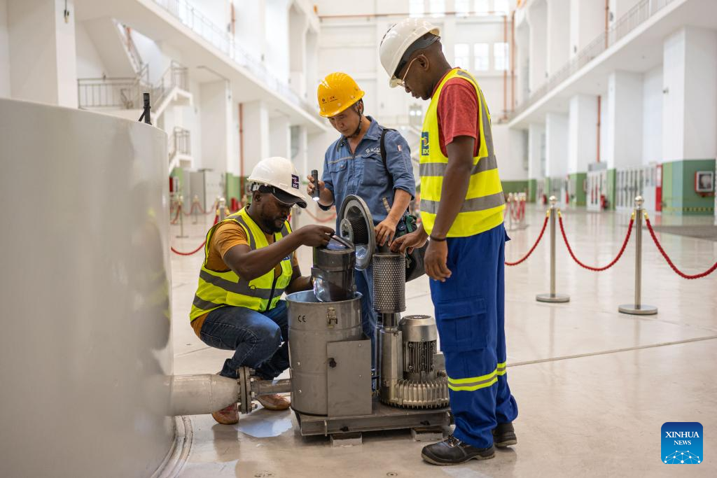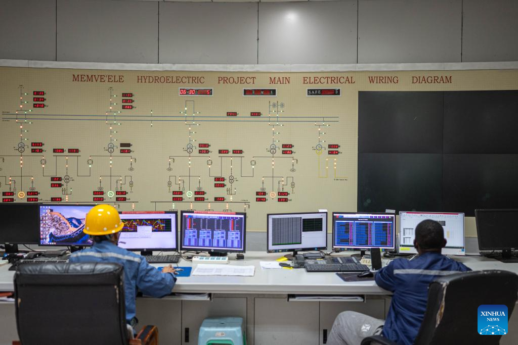 Engineers work at the Memve'ele Hydroelectric Power Station in the South Region of Cameroon, on June 30, 2025. Constructed by Sinohydro, Memve'ele Hydroelectric Power Station, a 211-megawatt hydroelectric power station in the Ntem Valley locality in Cameroon's South Region was officially handed over to Cameroonian authorities for operation in October 2024.(Xinhua/Wang Guansen)
