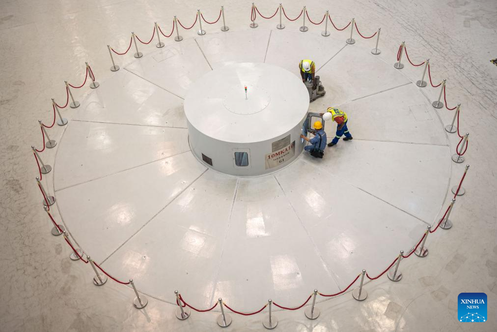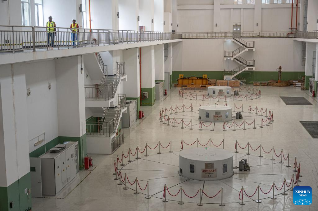 This photo taken on June 30, 2025 shows an interior view of the Memve'ele Hydroelectric Power Station in the South Region of Cameroon. Constructed by Sinohydro, Memve'ele Hydroelectric Power Station, a 211-megawatt hydroelectric power station in the Ntem Valley locality in Cameroon's South Region was officially handed over to Cameroonian authorities for operation in October 2024.(Xinhua/Wang Guansen)