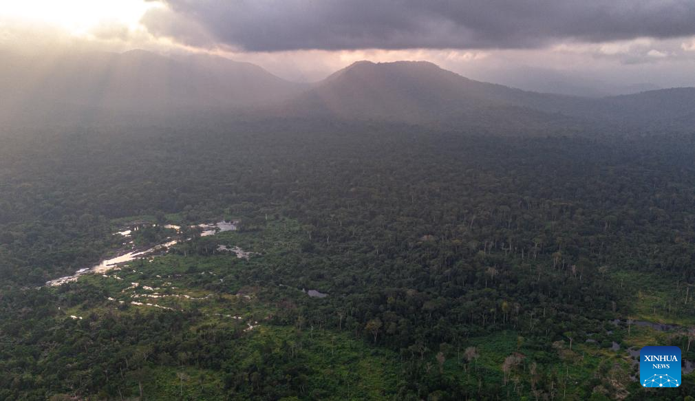 An aerial drone photo taken on June 29, 2025 shows a view of rain forest in the South Region of Cameroon. Constructed by Sinohydro, Memve'ele Hydroelectric Power Station, a 211-megawatt hydroelectric power station in the Ntem Valley locality in Cameroon's South Region was officially handed over to Cameroonian authorities for operation in October 2024.(Xinhua/Wang Guansen)