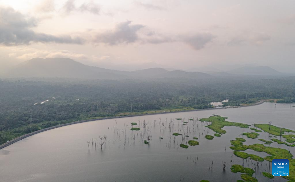 An aerial drone photo taken on June 29, 2025 shows the reservoir of the Memve'ele Hydroelectric Power Station in the South Region of Cameroon. Constructed by Sinohydro, Memve'ele Hydroelectric Power Station, a 211-megawatt hydroelectric power station in the Ntem Valley locality in Cameroon's South Region was officially handed over to Cameroonian authorities for operation in October 2024.(Xinhua/Wang Guansen)