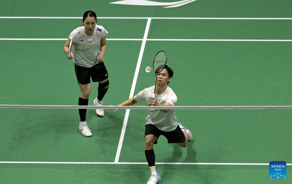 Watanabe Yuta/Matsutomo Misaki(front) of Japan compete against Loo Bing Kun/Go Pei Kee of Malaysia during the mixed doubles qualification match at Hong Kong Open badminton tournament 2025 in Hong Kong, south China, Sept. 9, 2025. (Xinhua/Lo Ping Fai)